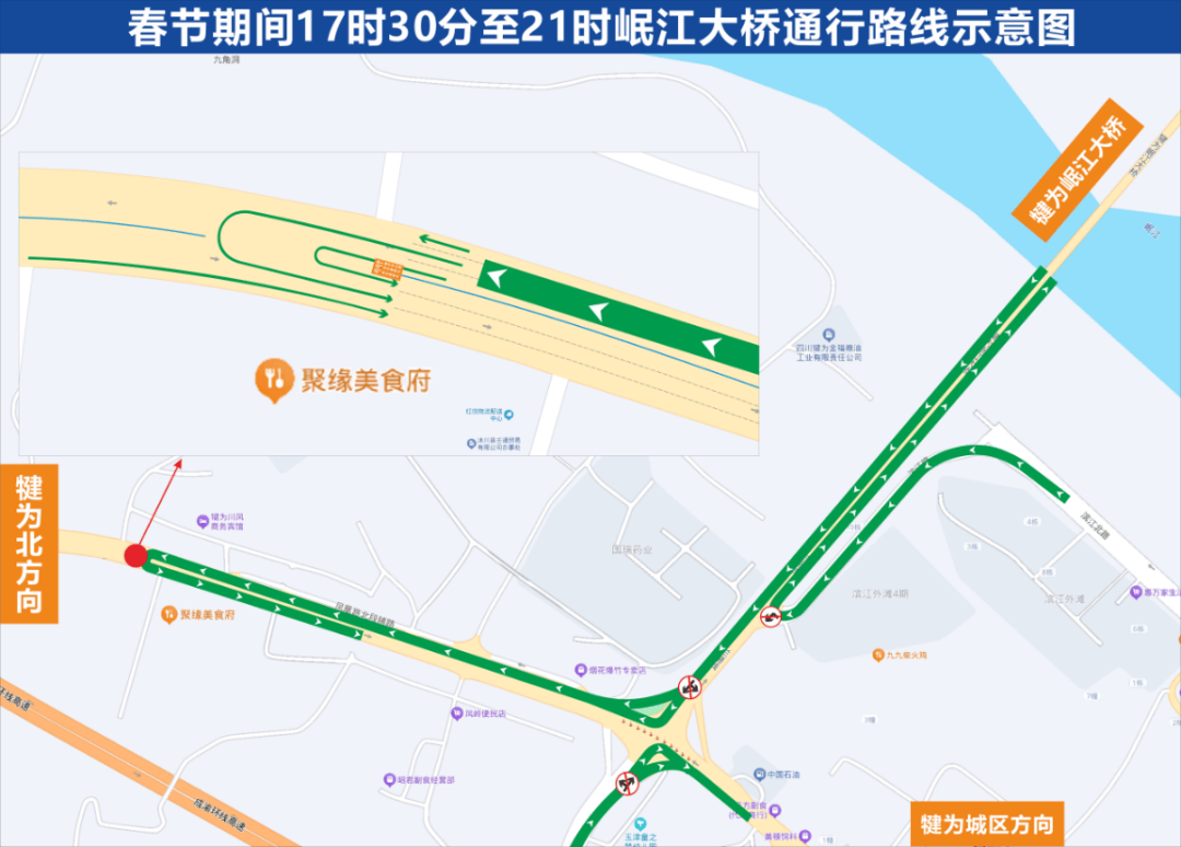 2月15日至2月23日,每日根据车流人流实际,适时对岷江一桥(旧大桥)采取单向通行管制措施,车辆由主城区方向往大佛景区方向单向出城。
