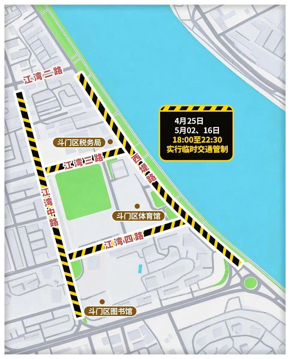 此外,4月25日、5月2日、5月16日,斗门体育馆周边路段在18:00—22:30时段,实行临时交通管制,具体安排如下: