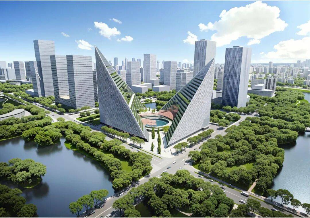 项目由CallisonRTKL负责设计,建筑主体由两座三角几何形塔楼构成,呈“V”字型对称布局,象征vivo品牌标识,同时形成山谷般的空间格局。其中较高一幢楼高25层,总高度161.99米,另一幢楼高22层,总高度137.59米。