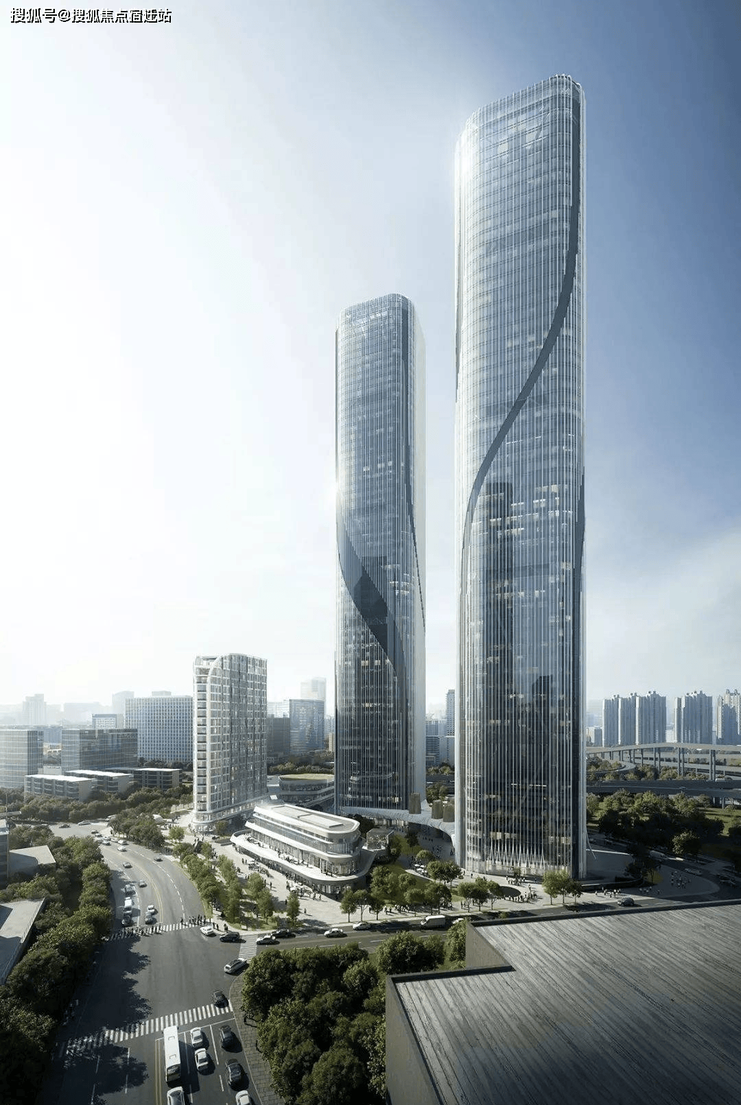 3层配套副楼作为商业及社区服务场所,横向的表皮处理仿佛是延绵起伏的江面,为市民提供了一个宜人通透的界面。屋顶平台的线条进一步向外延伸,将建筑与景观融为一体。具有艺术性的雨篷衔接双塔底层,为市民创造一个良好的步行体验。