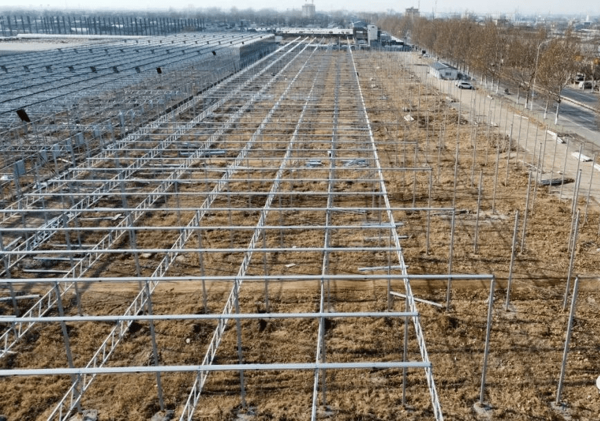 外遮阳架:外遮阳架安装在温室顶部,选用格构架和 50×50 及 50×50 热镀锌方管材加工承载能力强,使用寿命长。