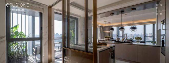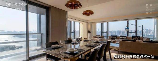 这客厅既是270°全景舱厅,无论全家在餐桌前欢聚一堂,还是孩子们在客厅嬉戏,一抬头便是以江景和城市为主题的巨幅油画。