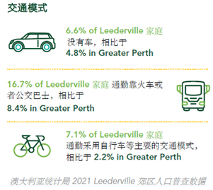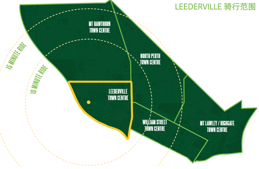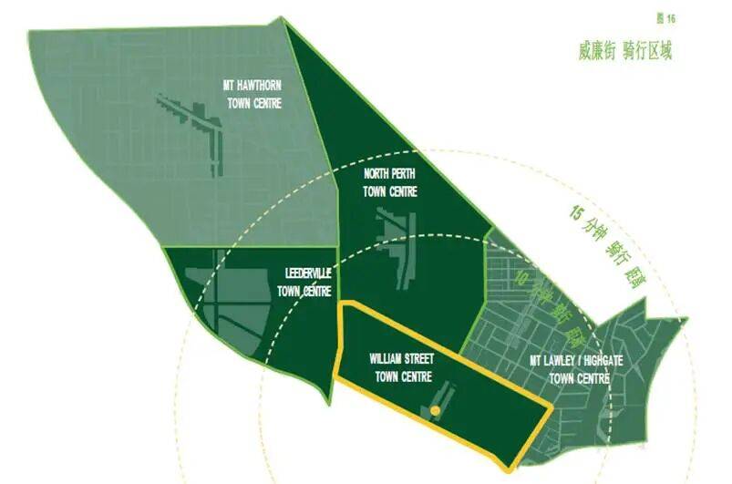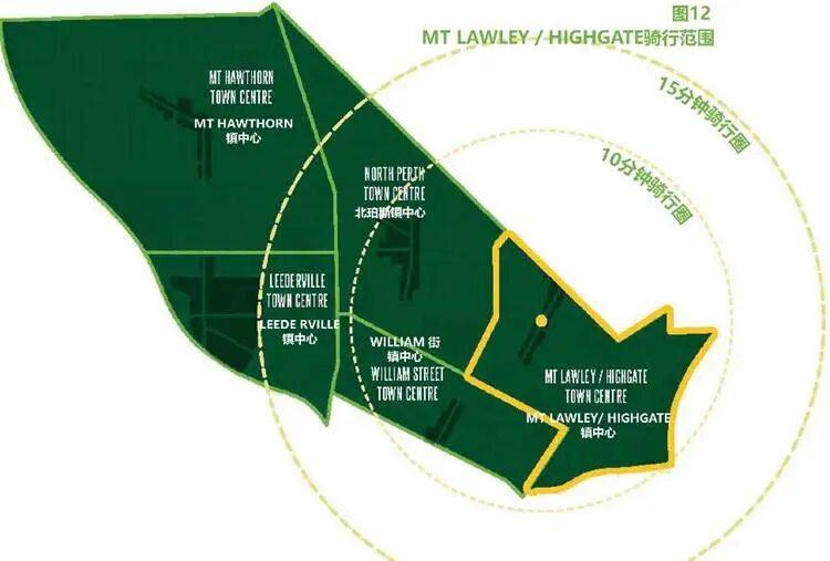 图2、展示了一名缺乏骑行经验的年轻骑行者从Leederville 镇中心出发,骑行10分钟和15分钟能抵达的范围。表明即使最少在1.5至2.5公里范围内,Leederville街区的所有居民都能到达该市5个城镇中心中的4个。