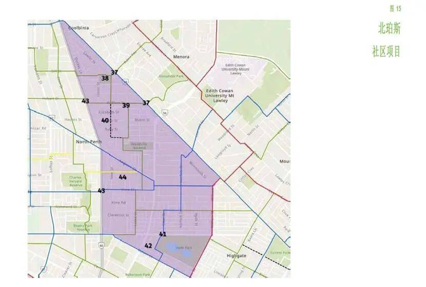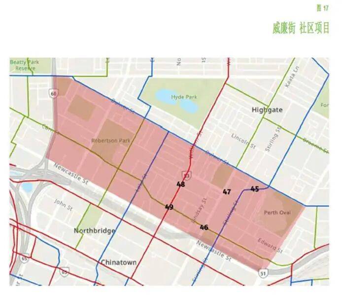 上表中列出了该市在Mt Lawley/Highgate地区实施的改善自行车网络的项目,并与图10(原文图13)中的地图相对应。该市的意图是继续与每个社区(包括居民和商家)合作,以完善这些社区规划,使其符合社区的各事项优先级。