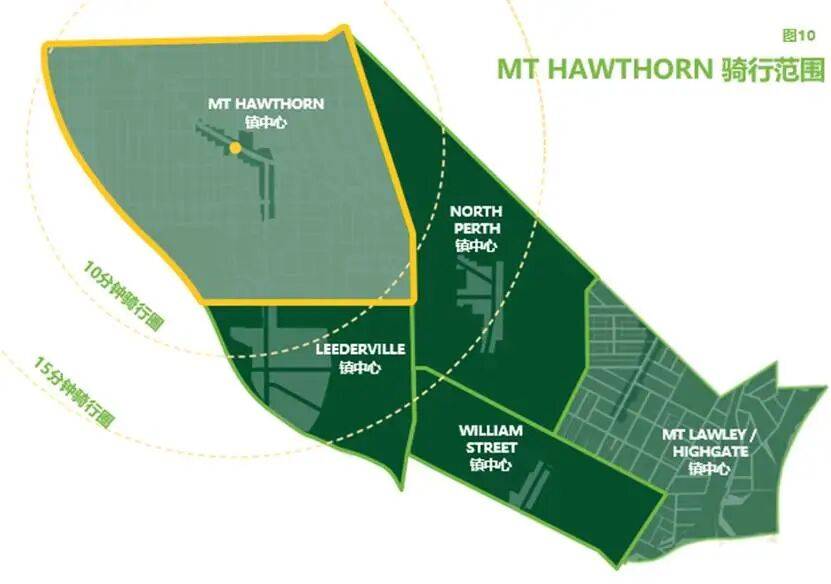 图5、显示了一名没有骑行经验的年轻骑行者从Mt Hawthorn镇中心出发的10分钟和15分钟骑行距离。图中显示即使在1.5-2.5公里的适度范围内,Mt Hawthorn社区的所有居民都能到达市内五个城镇中心中的三个。