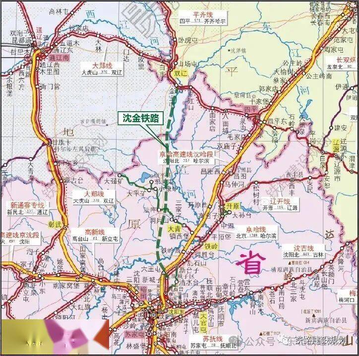 沈金铁路起自沈阳枢纽哈大铁路新城子站,经康平、法库县,接入内蒙古通辽市金宝屯镇的平齐铁路,最终延伸至双辽站。
