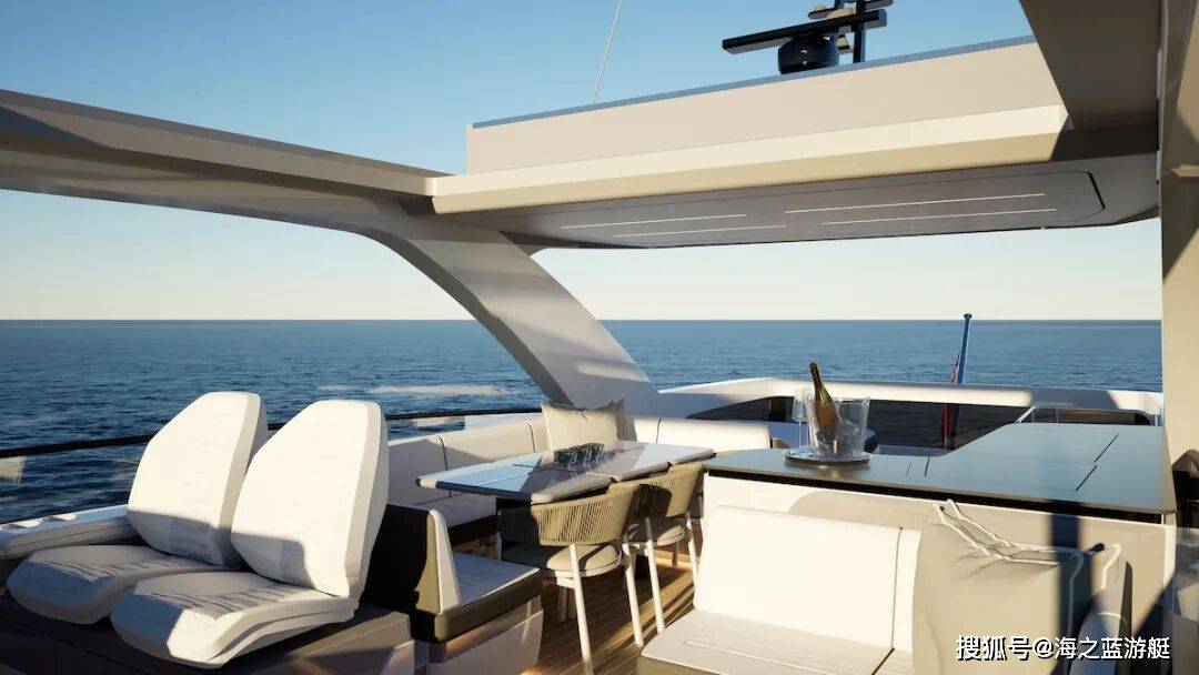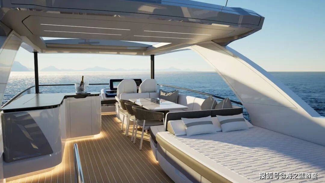 PEARL 73的户外空间系统采用模块化设计理念:主甲板后部配置了集成式户外厨房系统与可转换座席区;飞桥甲板提供包括液压升降餐台、嵌入式日光浴系统及定制化娱乐单元在内的多种配置方案;船艏休闲区则采用符合人体工程学的弧形座舱设计,并配备可伸缩遮阳系统。