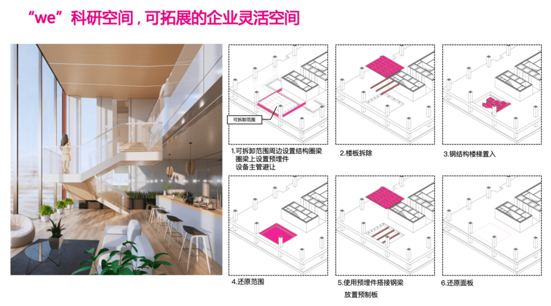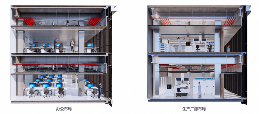 科创企业普遍存在成长周期短、扩张速度快的特征,传统固定办公空间难以满足。项目办公楼采用模块化大平层设计,并配置可拆卸楼板,满足企业“可合可分”的空间策略。