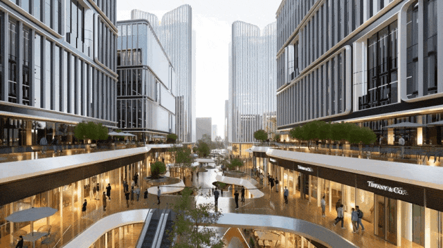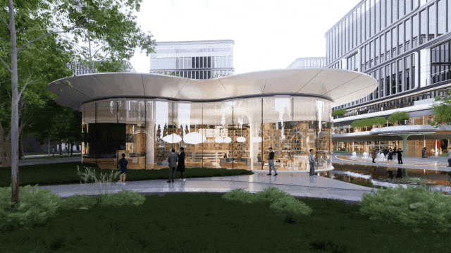 景观设计则以“花开四季”为线索,构建“如花瓣绽放”的庭院与商业街区,融合艺术展厅、办公庭院与社区街景,营造生态、多元、富有艺术感的城市氛围。