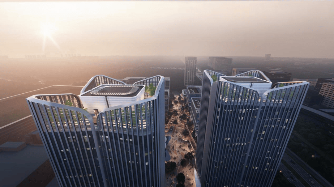 园区界面最具识别度的,是两幢百米高的“双子塔楼”,寓意光芯片与电芯片“双核协同”,也作为中国联通光电通信产业园与其合作企业共同发展的象征。